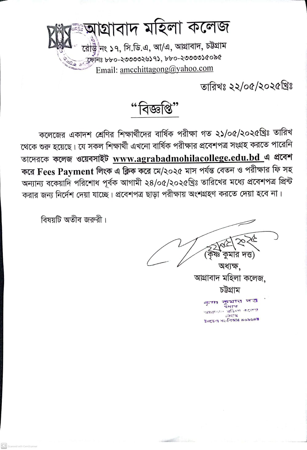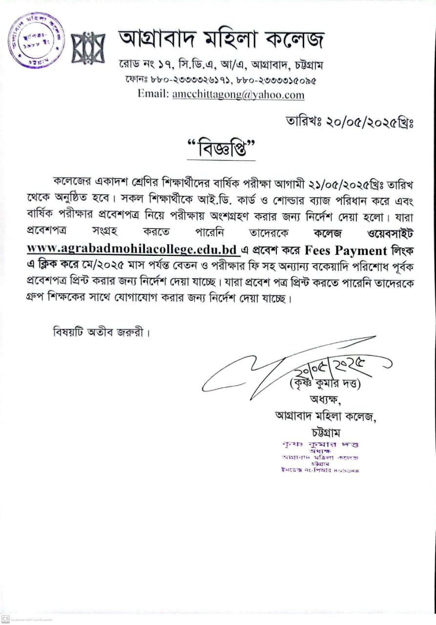05/22/2025 ২০২৪-২০২৫ শিক্ষাবর্ষে একাদশ শ্রেণির বার্ষিক পরিক্ষার প্রবেশপত্র ডাউনলোড ও ফিস পরিশোধের নির্দেশনা