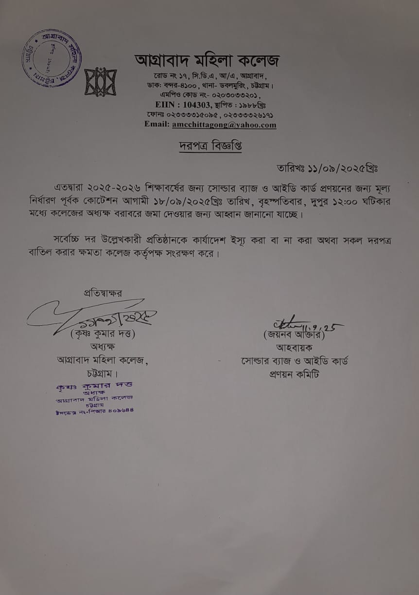 09/14/2025 ২০২৫-২০২৬ শিক্ষাবর্ষের জন্য সোল্ডার ব্যাজ ও আইডি কার্ড প্রস্তুতের জন্য দরপত্র আহবান বিজ্ঞপ্তি