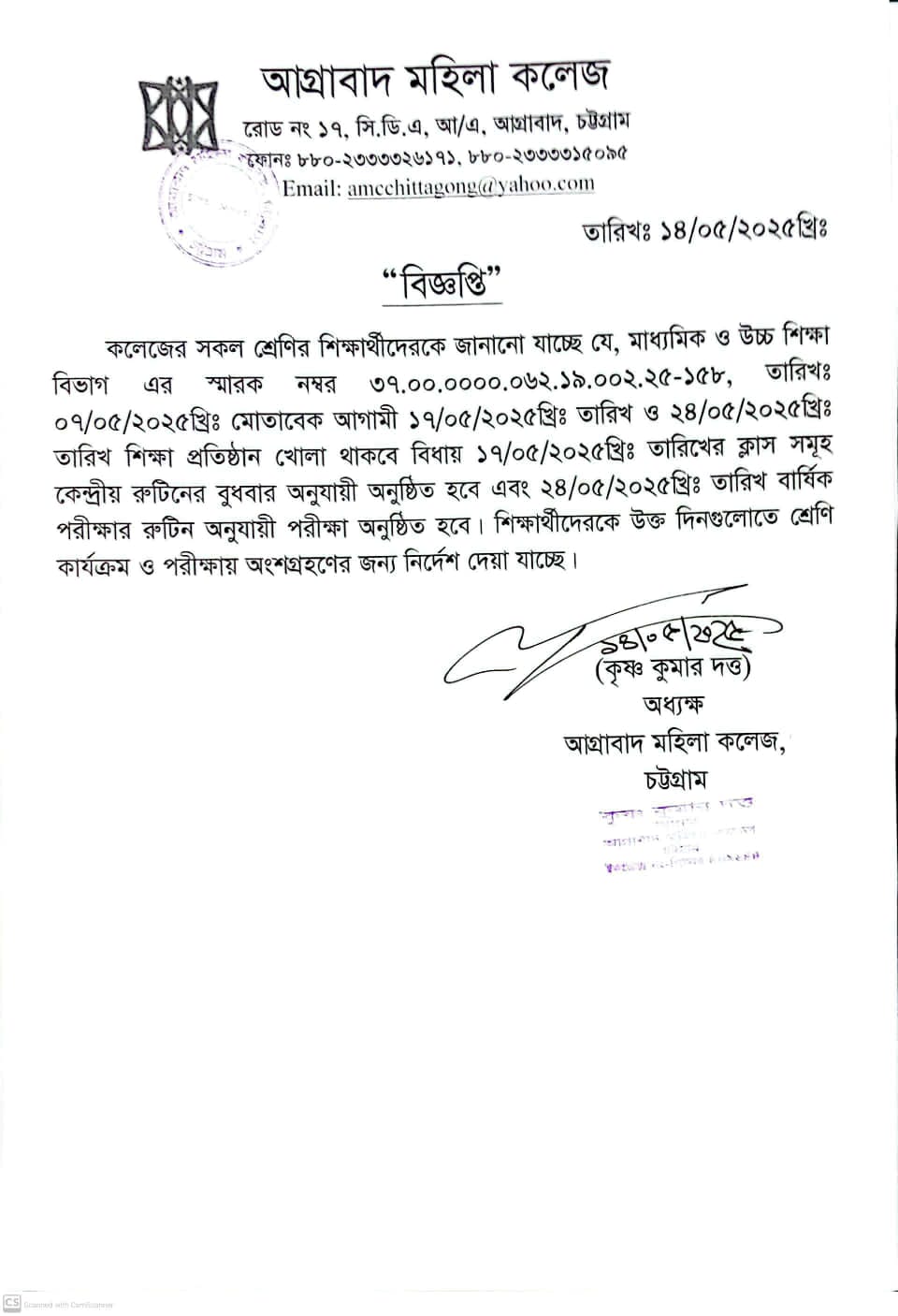 05/14/2025 শ্রেণি কার্যক্রম ও পরিক্ষায় অংশগ্রহণের জন্য নির্দেশনা