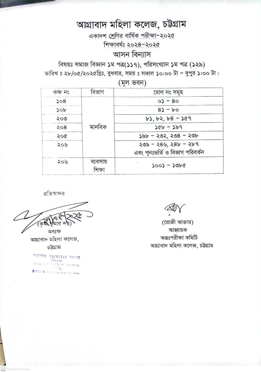 05/27/2025 ২৮/০৫/২০২৫ ইং তারিখ পরিক্ষার আসন বিন্যাস