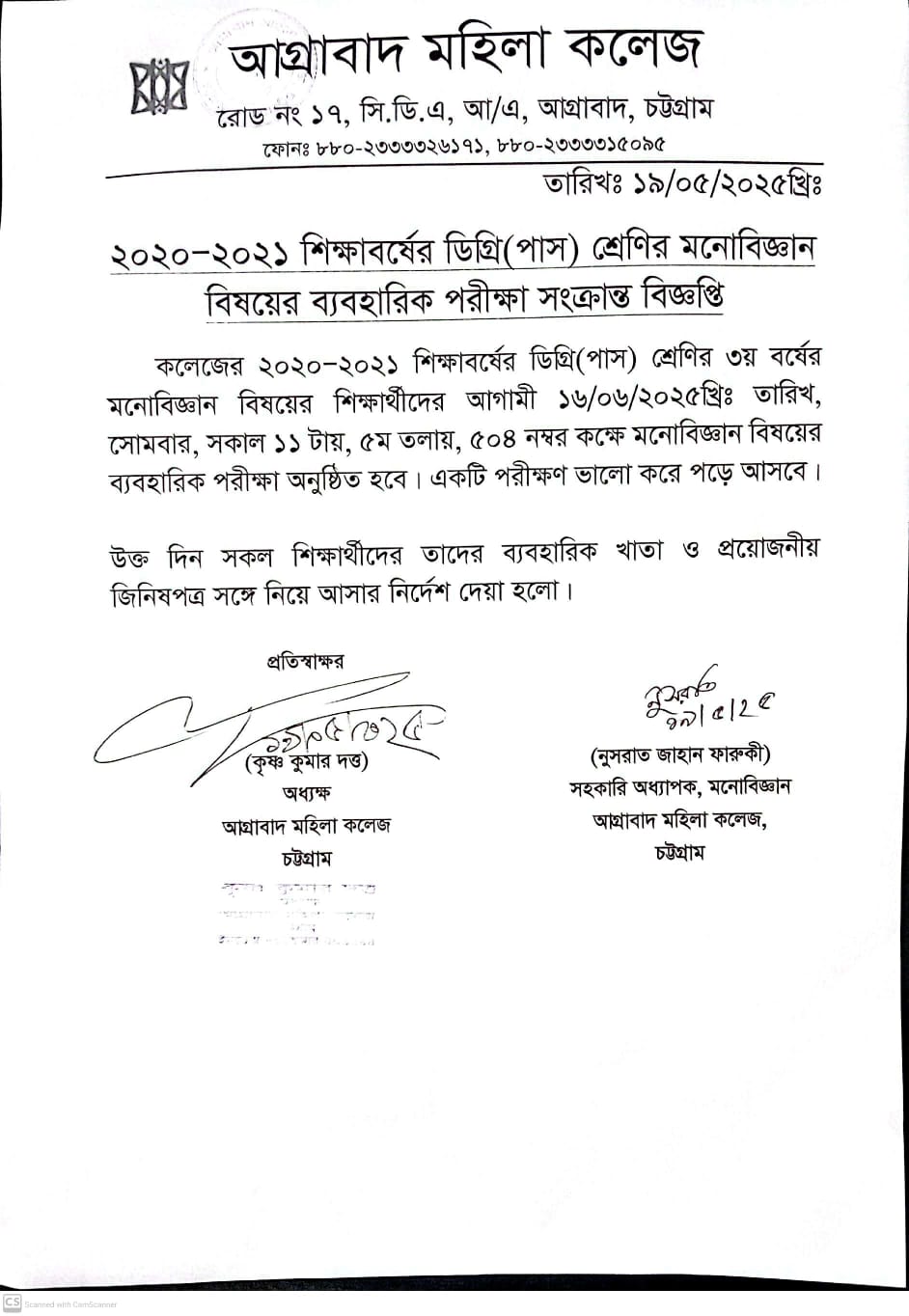 05/19/2025 ২০২০-২০২১ শিক্ষাবর্ষের ডিগ্রি (পাস) শ্রেণির মনোবিজ্ঞাব বিষয়ের ব্যবহারিক পরীক্ষা সংক্রান্ত বিজ্ঞপ্তি