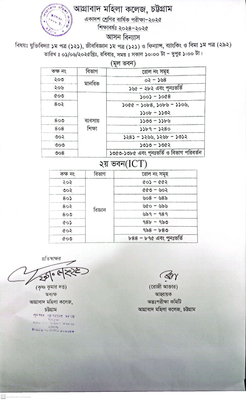 05/29/2025 ০১/০৬/২০২৫ ইং তারিখ পরিক্ষার আসন বিন্যাস