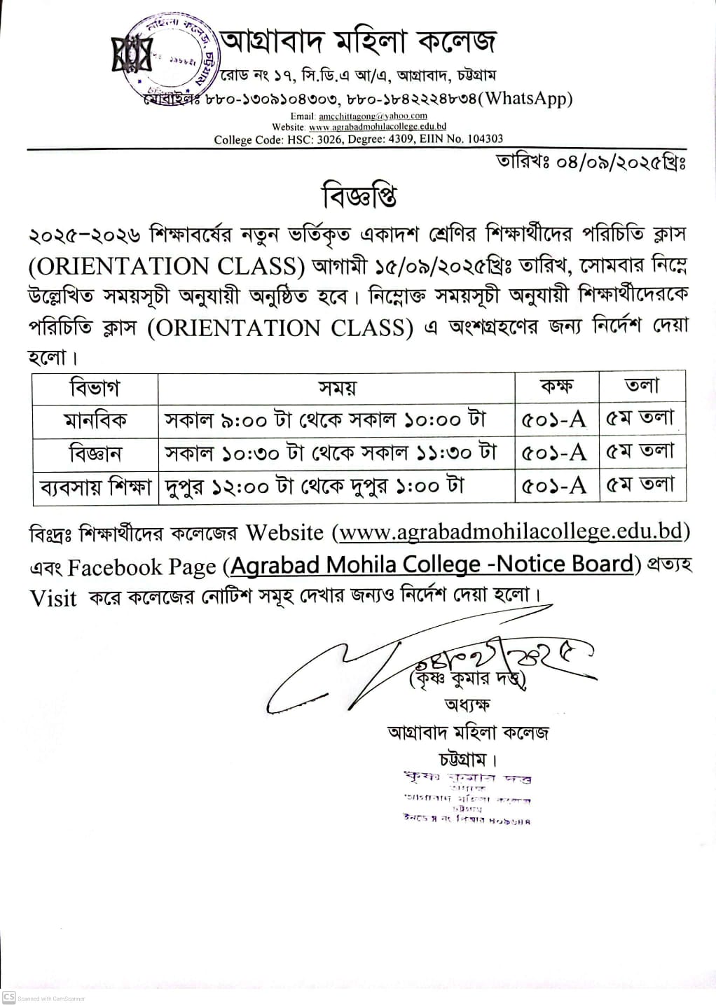 09/14/2025 ২০২৫-২৬ শিক্ষাবর্ষের একাদশ শ্রেণির পরিচিতি পর্ব ক্লাসের বিজ্ঞপ্তি
